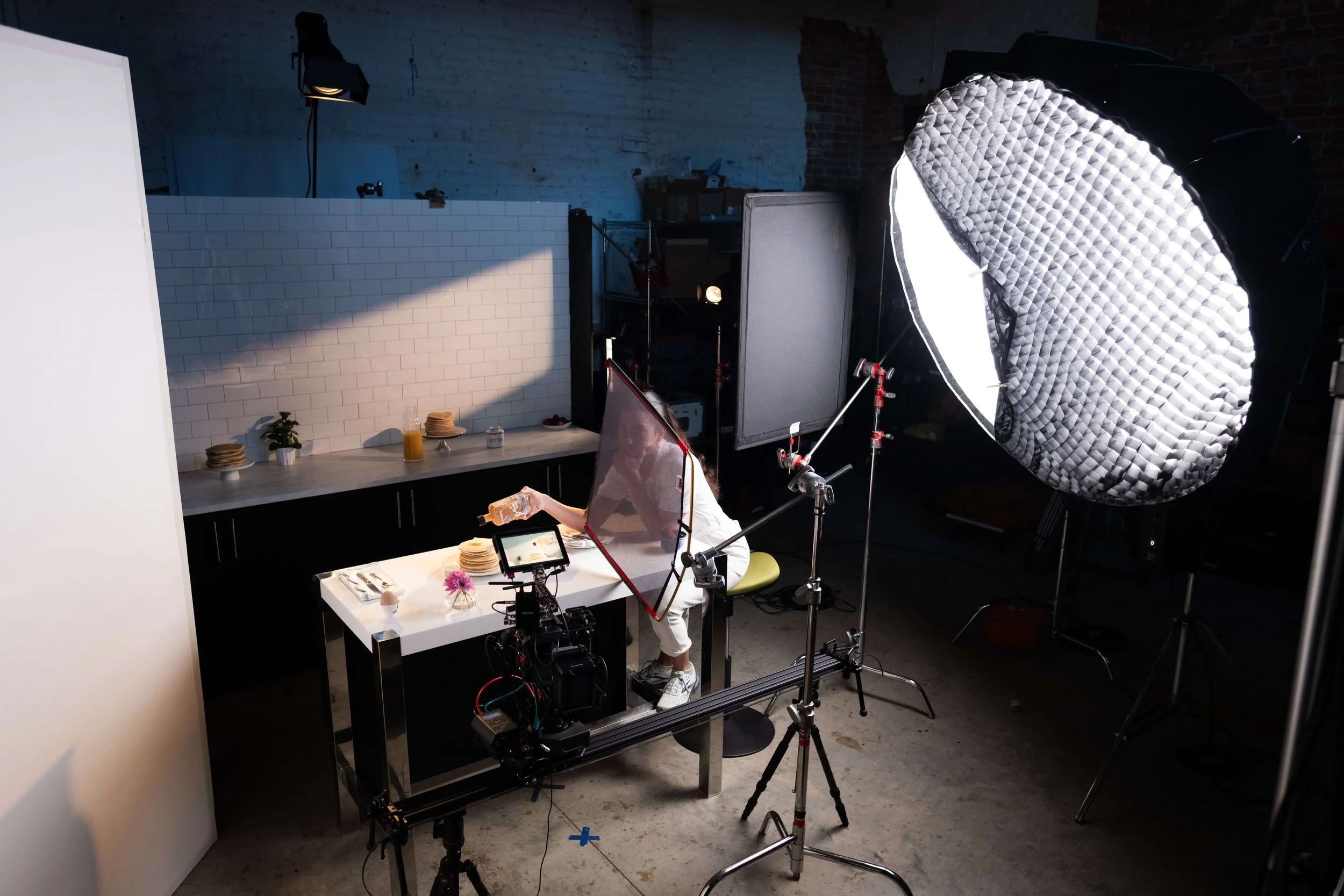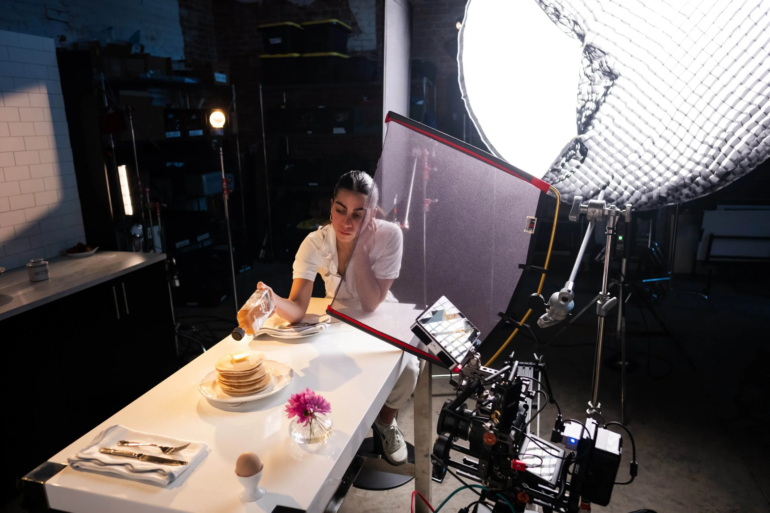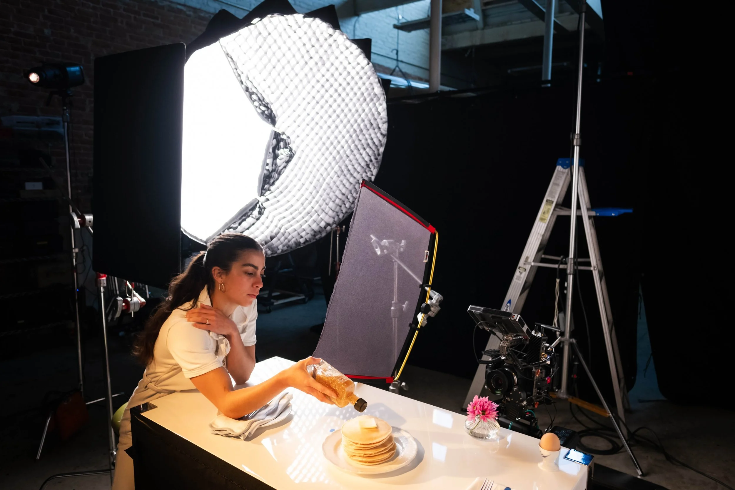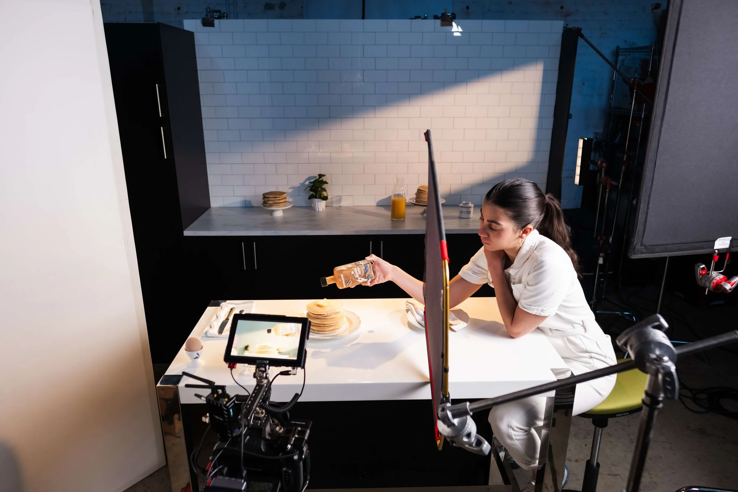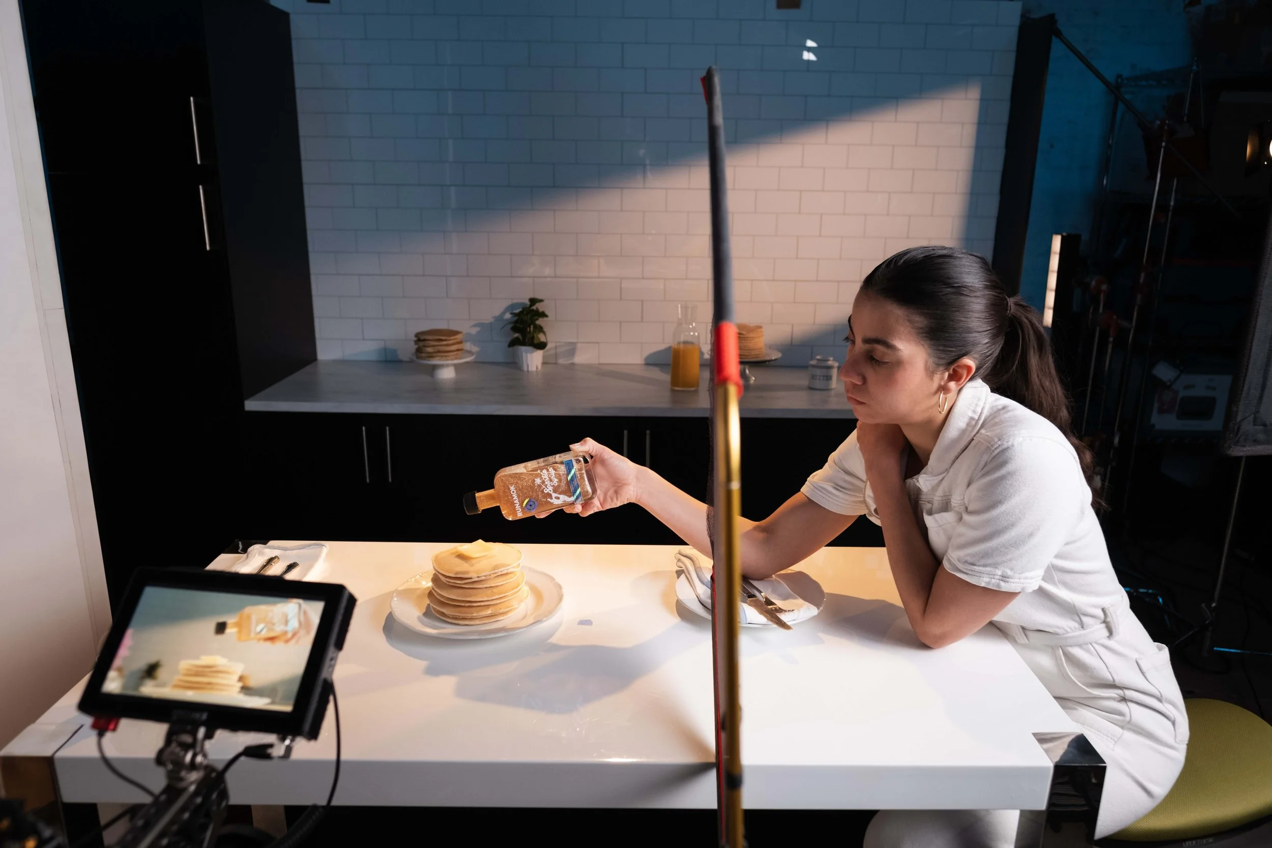 To build the look of a sunny morning kitchen, we added an Amaran 300c with a Leko attachment to cast a strong beam across the tiled backdrop. An Aputure 600x with a Light Dome 150 softbox keyed the scene from camera right at 90°, while a three-quarter backlight from an Aputure 60x and a dead backlight from an Amaran 150c added shape, morning warmth and pop. Everything was set to 3200K, except for the key light at 5600K to bring a crisp daylight contrast. An Aputure MT Pro was placed on the back table, off camera right to side-light props and extend subtle warmth. A V-flat was also placed 90° off camera left to fill in any deeper shadows.